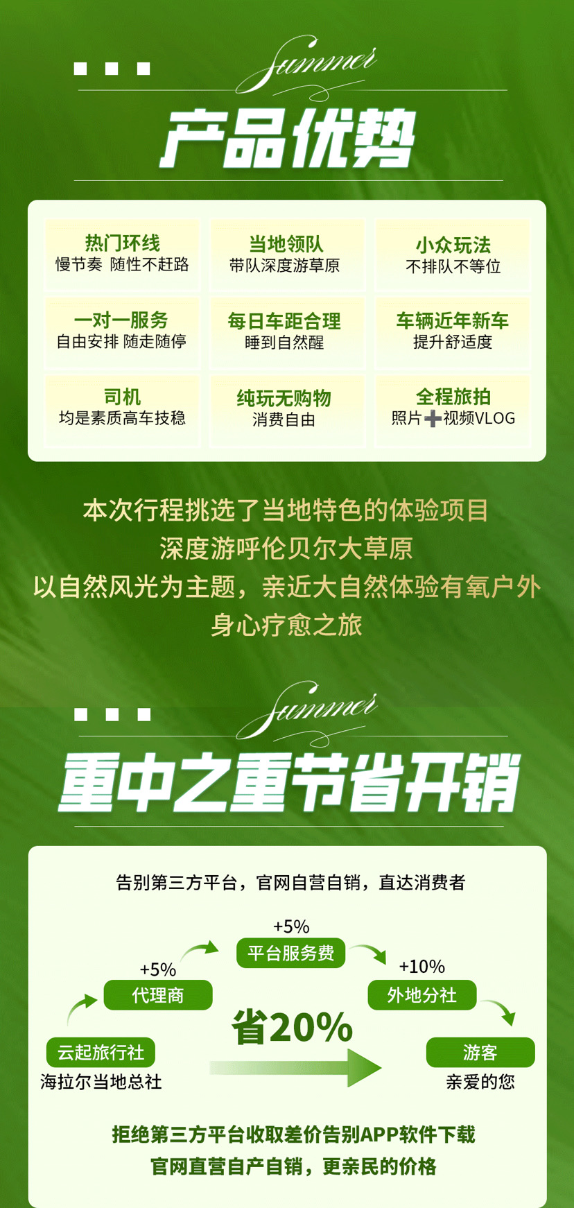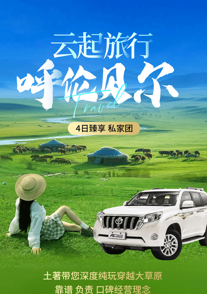 特別注明:本線(xiàn)路為呼倫貝爾云起旅行社獨(dú)創(chuàng)路線(xiàn),本線(xiàn)路為濃縮型,4天路線(xiàn)看的是5天風(fēng)景,所包含的景區(qū)與游玩的項(xiàng)目同比其他家要多出很多?。。。?/span>