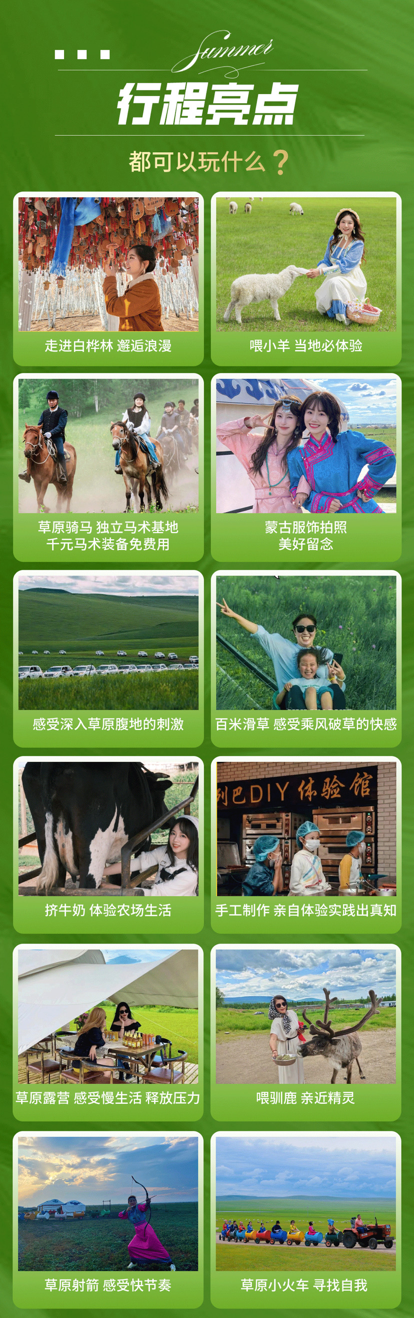 7.贈(zèng)送娛樂(lè)項(xiàng)目:穿蒙古服飾拍照、擠牛奶、喂小羊、草原托馬斯、品嘗蒙古小吃、祭祀敖包、蒙古小課堂、蒙古燒燙氈畫(huà)、網(wǎng)紅天梯打卡、篝火晚會(huì)、民族樂(lè)器展示、夜游滿(mǎn)洲里、旅行社責(zé)任險(xiǎn)、人身意外險(xiǎn)(雙重保險(xiǎn)為我們的旅行保駕護(hù)航)