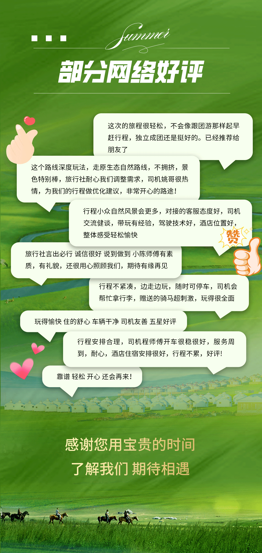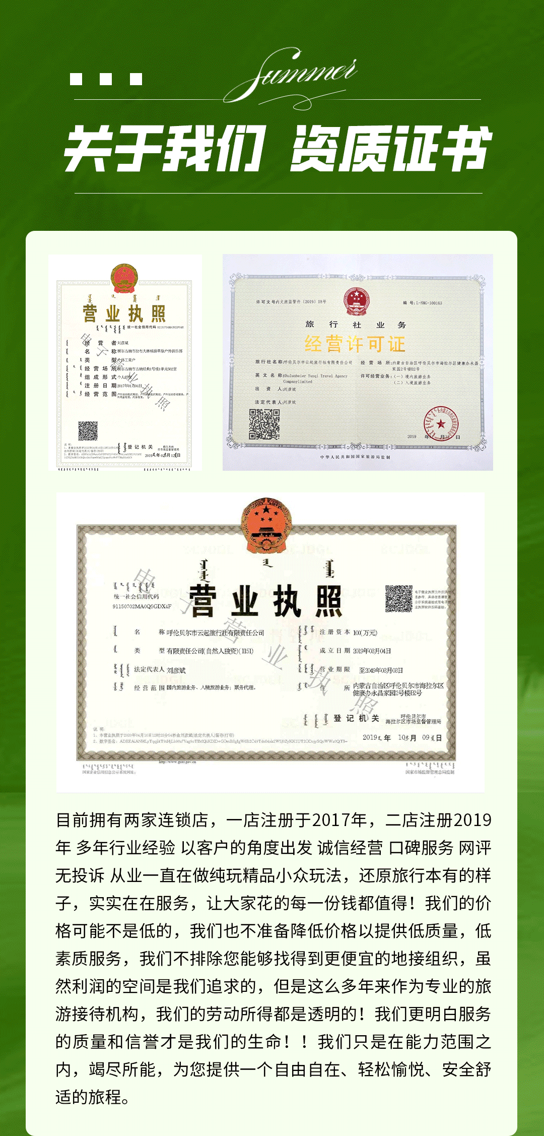 3.眾多好評(píng)口碑宣傳,我們專(zhuān)注戶(hù)外純玩原生態(tài)體驗(yàn)式旅行、行程為八字環(huán)線(xiàn)不走回頭路避免重復(fù)路程,會(huì)讓您的呼倫貝爾之旅不虛此行