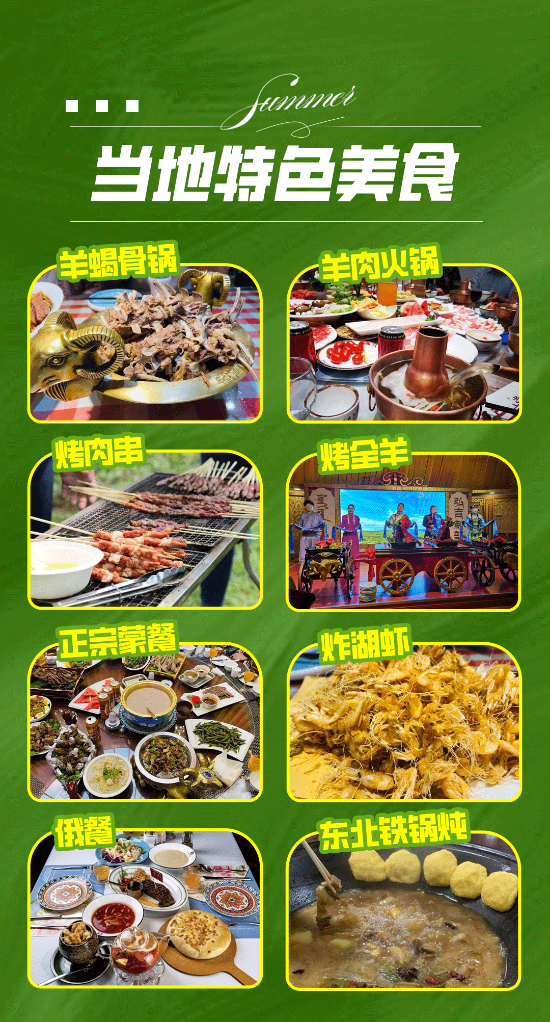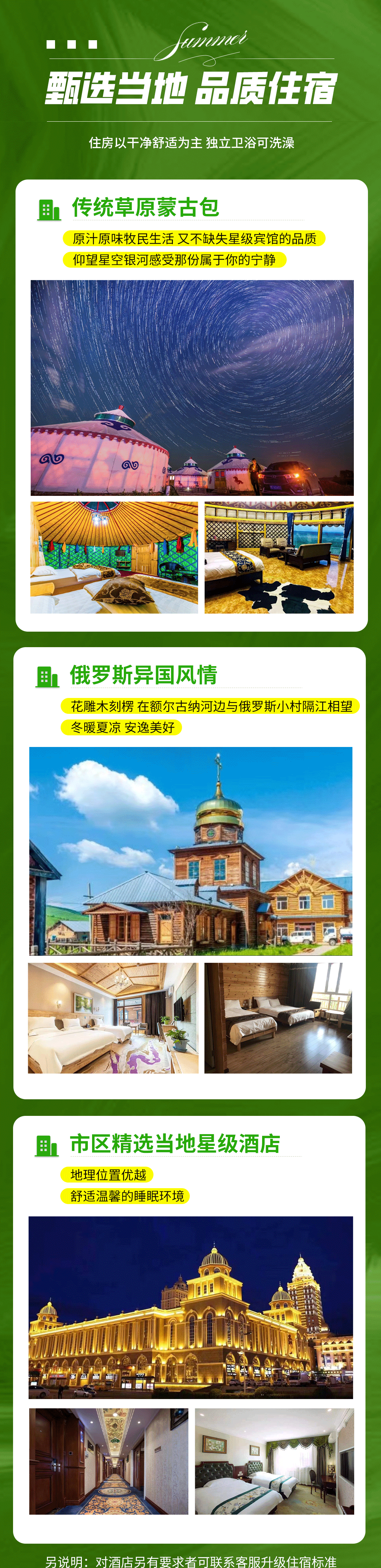 ②套餐住宿:蒙星大酒店、萬(wàn)庭深呼吸主題酒店、中科麗麗婭俄式酒店、伊戈莊園、千鶴大酒店、葉尼塞莊園、古納國(guó)與際酒店、額爾古納大酒店